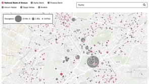 Foreclosures of apartments in Athens are displayed in responsive, eye-catching design. Readers’ involvement is enhanced by interactivity, color coding of data, clickable & zoomable map features.